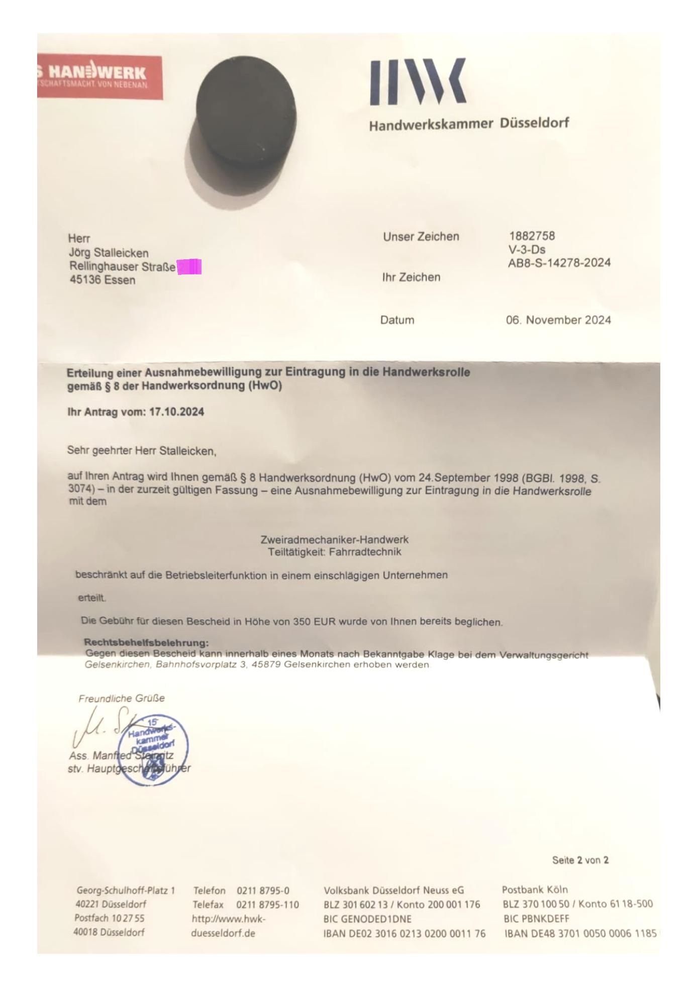 Wir (Fahrradladen Mertes) sind Mitglied im Handwerkskammer Düsseldorf (HWK) und Industriehandelskammer (IHK) MEO! Unsere Betriebsleiter Jan. F. ist Zweiradmechaniker!